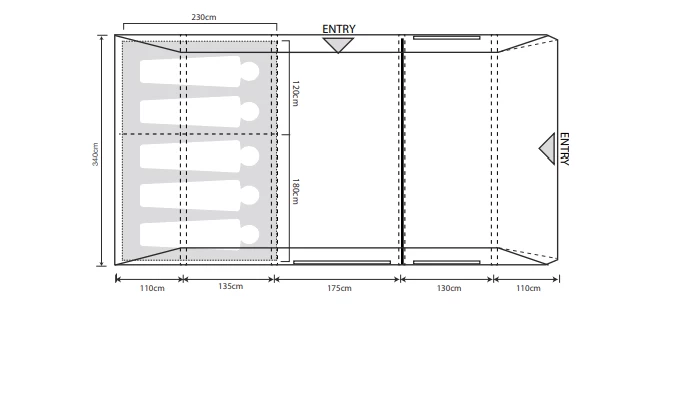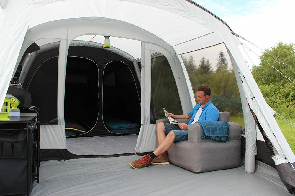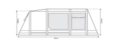 | Features | New Double Width Patio Style Side Door with Phoenix Mesh ventilation Valves: Dynamic Speed Valve for quick inflation and deflation. Rear Bedroom Vortex Ventilation system to reduce condensation. Integral Front Canopy Fully zip-around side door with mesh panel and zip vent. Tinted PVC Windows with zipped curtains. 5 Person Inner with Zipped Divider Includes storm straps for added stability when pitching. NEW darker bedrooms, offer a longer night's sleep by reducing early morning light. Front Zip to add additional canopy Adjustable Pegging system |