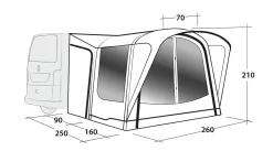 | Features | Designed for Campervans with a fitting height from 175-200cm Large front door with additional insect mesh screen HookTrack System allows versatile positioning of lights and other small accessories Large tinted windows for a light-filled interior with curtains for privacy Heavy Duty zips enhance performance Large front canopy to provide shelter from rain and sun glare Full open rear for easy access to vehicle Pre-attached luminous guylines for convenience and fast pitching Groundsheet for Link Access Zone with built-in draught excluder skirt |