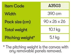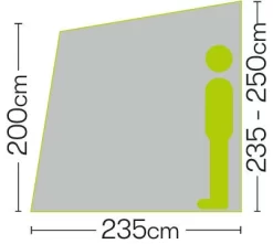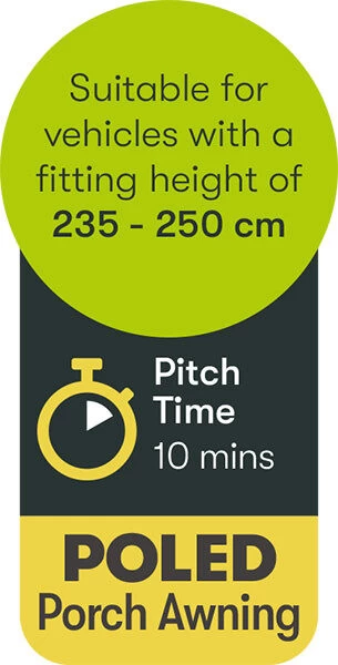 Quest Falcon 390 poled caravan Awning – Designed to be an easy use budget friendly porch awning. Lightweight and adjustable for great pitching and great for using on uneven ground. Fits to vans with a fitting height between 235-250cm Can be pitched in 15 minutes by one person giving you more time to do the things you love whilst away on your break.