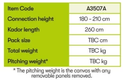 Fabric – Quest Tec150 Low fitting – Vehicle Connection height: 180 – 210cm Weight 14.5kg Has removable panels to give you a lighter weight to work with, which would take the pitching weight to 13kg. Pack size 82 x 31 x 31cm 4000mm Hydrostatic Head 1 Year warranty