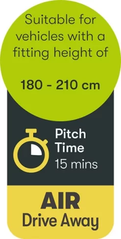 The Quest Falcon Air Drive Away awning, designed in the low line fitting, for vans between a height of 180-210cm – which applies to most VW style camper vans. It has a drive-away design, allowing it to be left free-standing on the campsite, whilst the van is taken off-site for the day. Further to this, the Air design makes pitching a very simplistic affair. The Falcon has a 150 Denier polyester fabric, making it ideal for lightweight campers, with a total weight of 14.5kg.