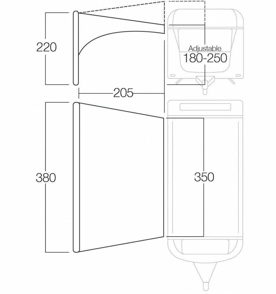 The Vango Airbeam Sun Canopy, with a width of 350cm, fits onto camper vans, motorhomes and caravans. The sun canopy is a fixed canopy, meaning it requires the vehicle to stand. Perfect for adding an auxiliary living space to your vehicle, and shelter from the sunshine or the rain, with optional sun walls to cover the sides of the Sun Canopy. Fits into the 6mm groove on the caravan, or any fixing strip on a caravan or motorhome.