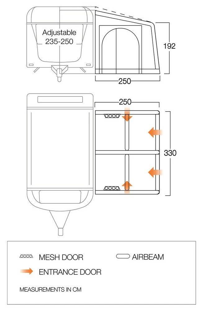 The Balletto 330 Air Pro is really versatile, with ample living space, and has the ability to remove side doors, zip on an additional side annex, storage space, or additional sleeping space. Further to this, there are optional front mesh doors, which can be zipped in place of the front doors, for bug-free mesh ventilation. All of these accessories are sold separately, or as part of the bundle deals below!