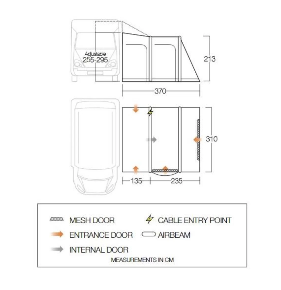 The Vango Kela V Tall is an innovative drive-away awning from Vango, which was been vastly improved and updated in 2019. Continuing on, the Kela V Tall features two connecting side doors, which enhance the entry / exit into the van or motorhome, as you can enter without going through the living or sleeping space. Ideal for those who have taller motorhomes or vans, as the attachment is between 245 – 290cm. The Kela Tall no longer comes with an optional inner, which has space to sleep two people within, you have to purchase this accessory separately, or as part of the bundles below. However, vast improvements have been made to the, which now has a Double Ripstop, 420 Denier fabric, a far more durable fabric when compared with the 150 Denier on the older models.