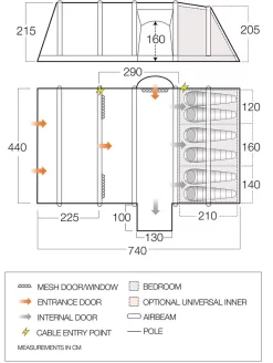 | Features | Excel Airbeam Specifications: Vango Airbeam – quick pitching, strong structure. Vango Phantom Pump Included with Gauge Double living space for larger families. Pre-attached front awning ideal for socialising and storage. Fully sewn-in groundsheet provides bug-free camping. Waterproof Groundsheet ideal for adding insulation from the elements. Clear Access bedrooms – wider openings to inner tent. Midnight Bedrooms – very dark bedrooms for a better night's sleep. Integrated Mesh Door – to left side Mesh Internal Windows increase air flow. Part Mesh inner doors for added Air flow. Toggled curtains – provides privacy when required Toggled Privacy Curtains in the inner tents. Front and Rear Storm Anchors – offer greater stability. Skytrack II – a flexible hanging system for accessories or lighting. Cable-entry point for electrics access. High Cable entry point for electrical lighting wires. Expandable carry case – easier to pack away afterwards. Mesh Flysheet Inner Doors give greater ventilation. Storage Pod – offers a pod for keeping it tidy, or can double as a place to put the camp toilet. Bedroom pockets for storing valuables. King Pole Access – perfect for making a canopy from the front of the door. Covered Side Door Entry on left side, for rain safe access into the living space. Double-zip door for flexible door opening. Lantern Hanging Points – ideal for hanging accessories and lighting strips. High visibility guy lines ideal for pitching against the wind, and are very bright to help prevent tripping. Fully wind and rain tested in accordance to EN5912 |