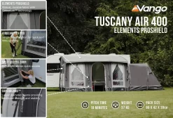 A large, stylish caravan awning, which is ideal for larger caravans with a greater width. The Tuscany Air 400 is part of the Elements ProShield collection, which is the Vango mid-range touring awnings, offering durable, reliable options for shorter term pitching. The ProShield is highly weather resistant , with Colourlok technology, which is designed to lower the effects of UV degradation, and UV fading, giving a greater lifetime to the product.