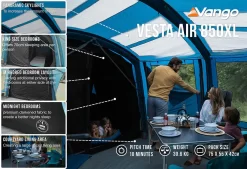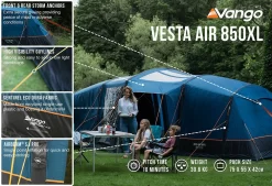 The Vango Vesta 850xl is a superb vis-a-vis style tent, with off-set opposing bedrooms, on either side of a large living space. It is designed to sleep up to eight people and is jam-packed with excellent Vango features. The tried and tested AirBeam structure helps to enhance the ease of pitching, making it the perfect option for those needing a hassle-free setup.