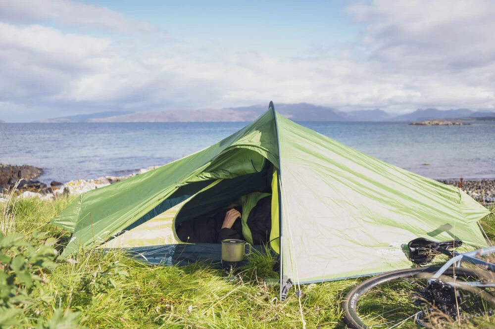 A 70 denier protex eco flysheet is created from single us plastics and offers a hydrostatic head rating of 3000mm which is more than acceptable for the UK weather in spring and summer, it is a great little tent that you can take abroad with a small pack size and a unique Fast Pack bag that can be securely attached to bike handlebars
