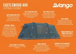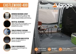 Part of the Sentinel Active Collection, the Vango Castlewood 400 is a lighter-weight four-person tent, with an offset mirrored bedroom layout, often referred to as a vis-a-vis design. It has a host of great features, such as the 70 Denier polyester fabric, which is designed to be highly waterproof and ideal for the UK climate, whilst still remaining lightweight enough for touring camping. Further to this, it comes with a sewn-in groundsheet, with drop-down doors for easier access for prams and wheelchairs to prevent tripping hazards.