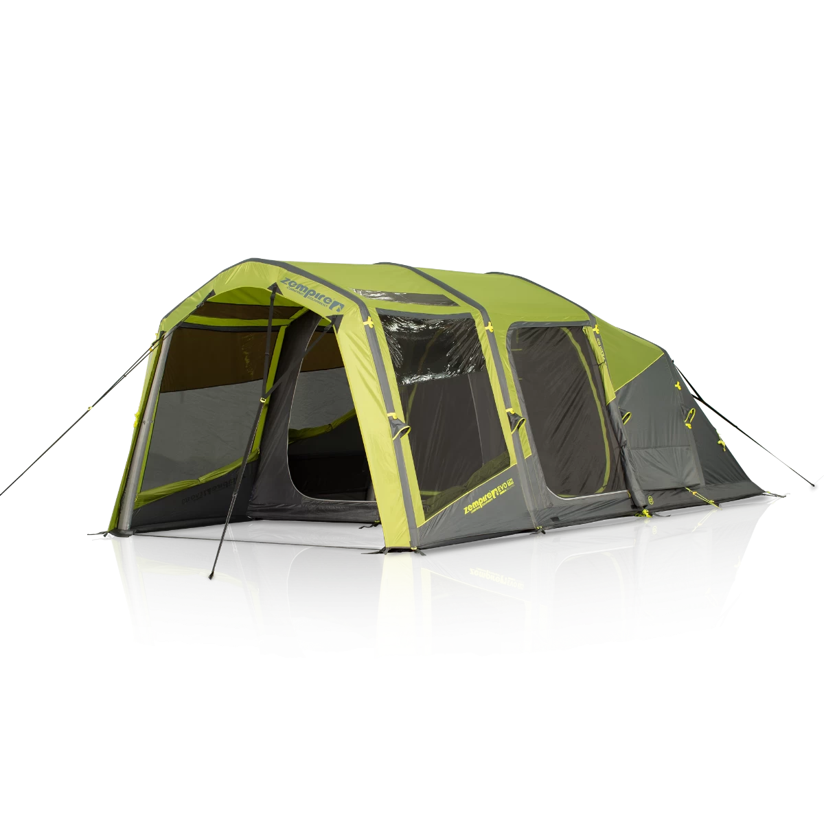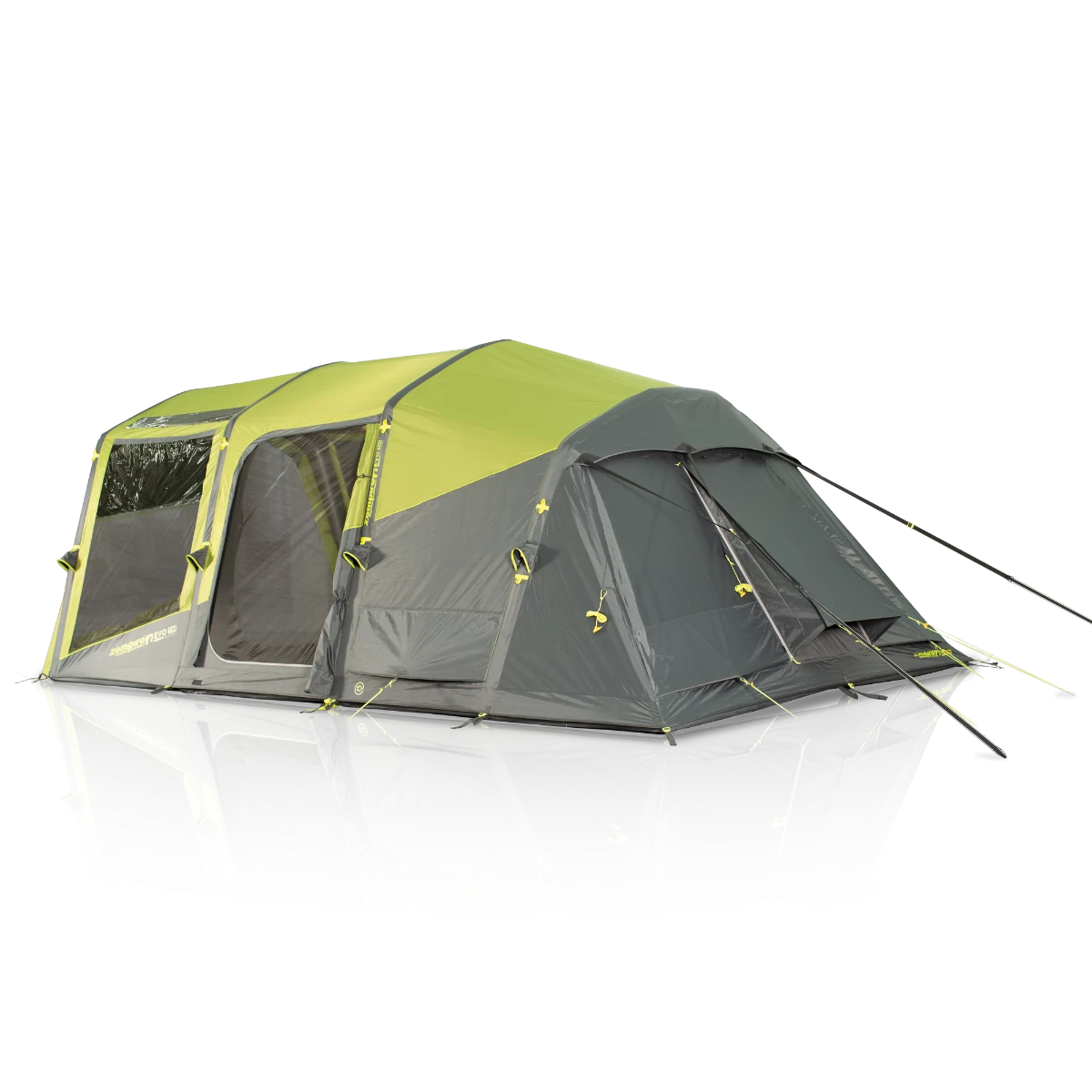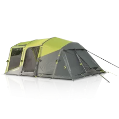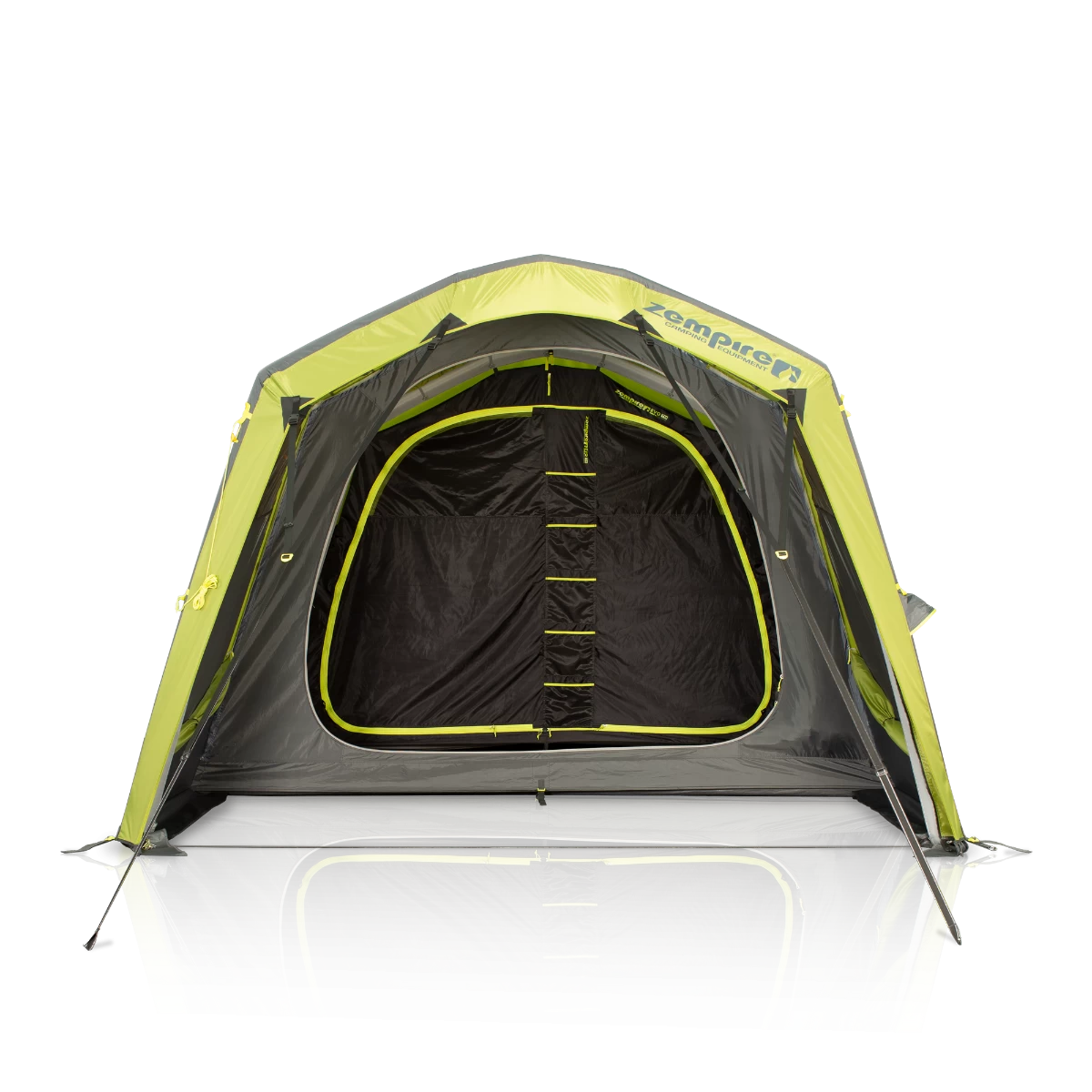 The Zempire Evo TM V2 is a four-berth tent, with three zones: bedroom for 4, full standing height livig space living and awning area. Using SeroLink inflatable design, this connects the air frame directly to the flysheet, helping increase the strength but also reduces weight and bulk. The beams are also pre angled for greater headroom and to aid rigidity, strength and living space. Furthermore, the 150-denier polyester fabric is durable, and offers the best weight to quality ratio for a tent of this size, with a high hydrostatic head of 6000mm, a UPF rating of 50 and a fire retardant coating gives you confidence it has been designed with safety in mind.